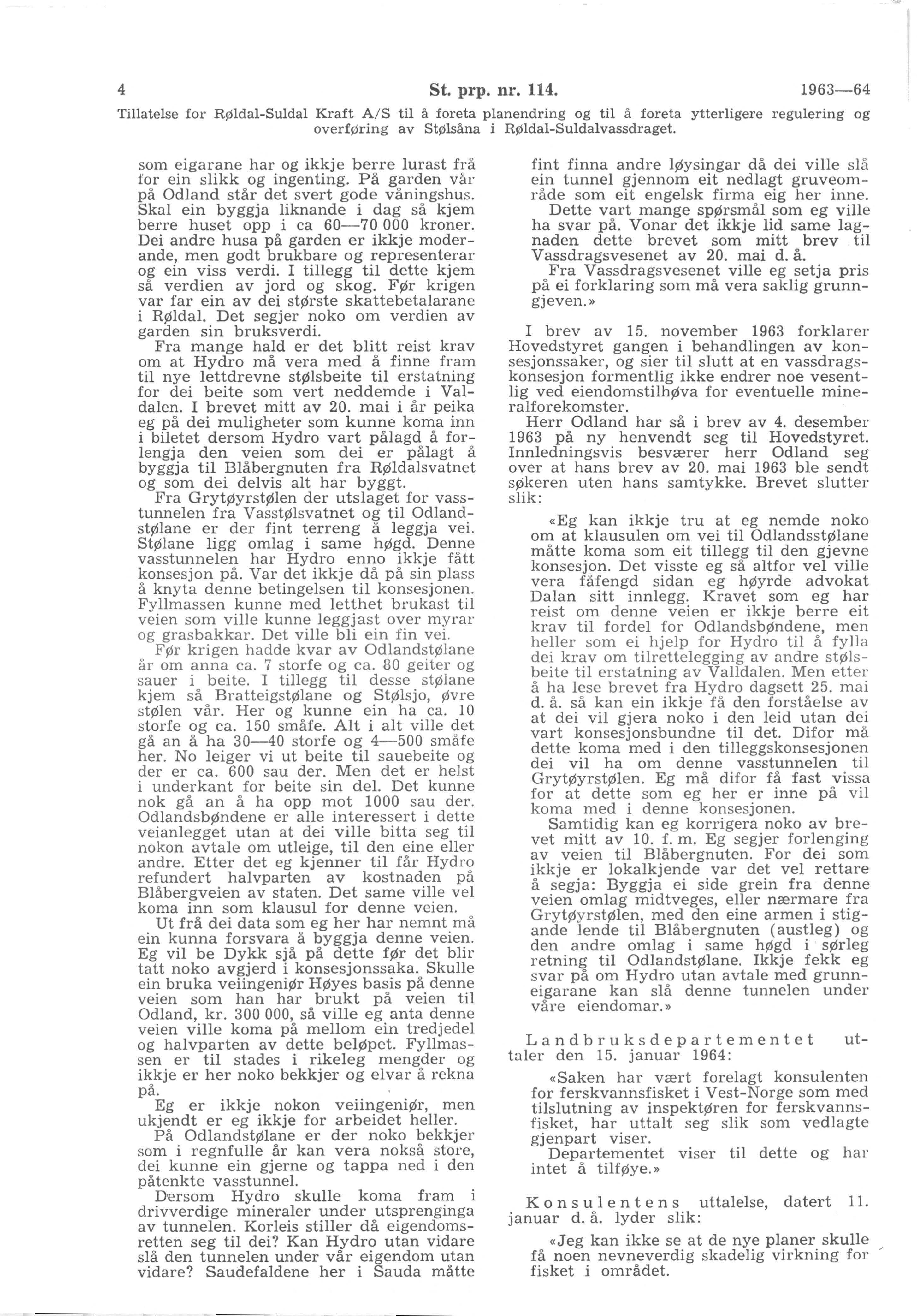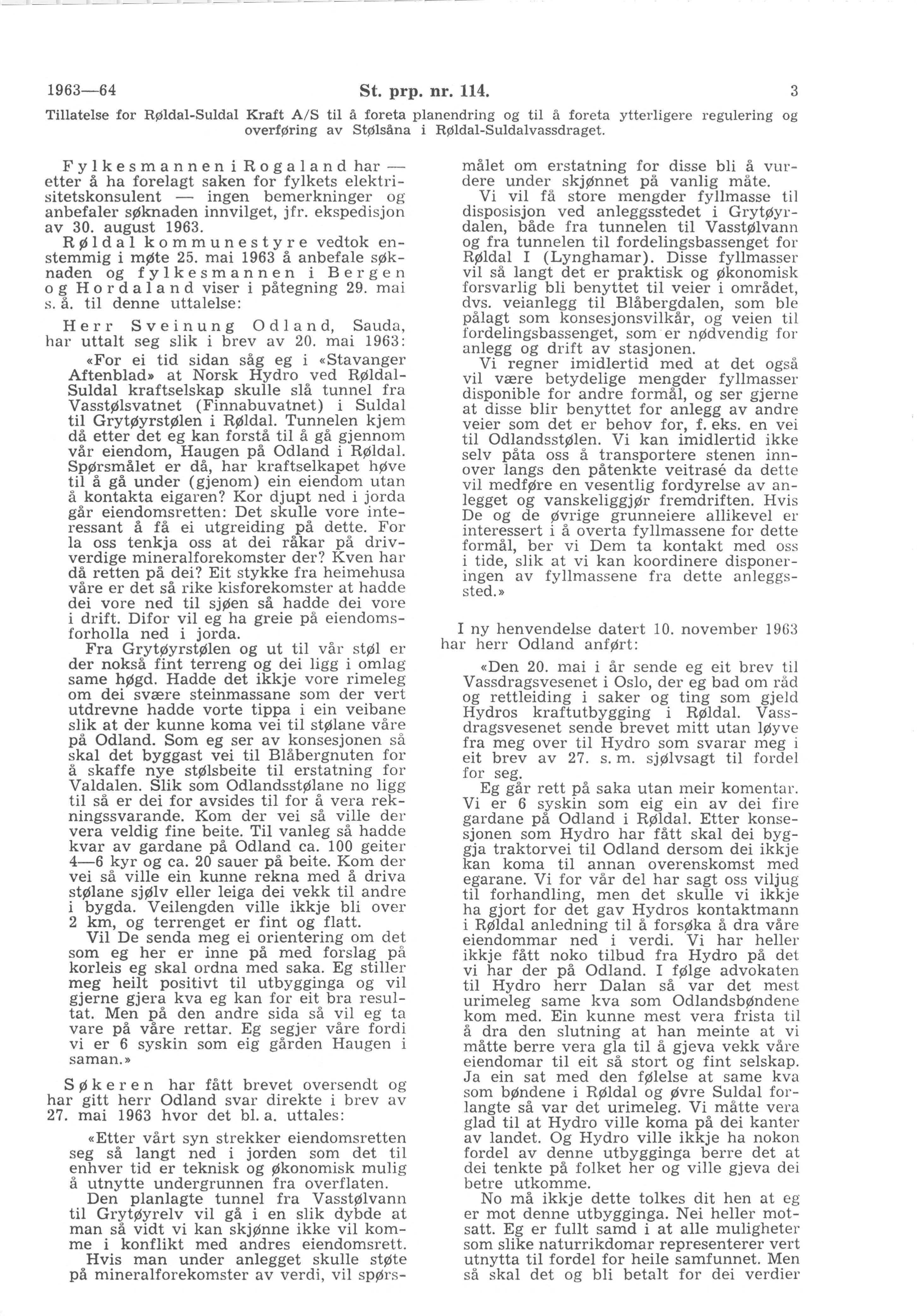 «For ei tid sidan såg eg i «Stavanger Aftenblad» at Norsk Hydro ved Røldal-Suldal kraftselskap skulle slå tunnel fra Vasstølsvatnet (Finnabuvatnet) i Suldal til Grytøyrstølen i Røldal. Tunnelen kjem då etter det eg kan forstå til å gå gjennom vår eiendom, Haugen på Odland i Røldal. Spørsmålet er då, har kraftselkapet høve til å gå under (gjenom) ein eiendom utan å kontakta eigaren? Kor djupt ned i jorda går eiendomsretten: Det skulle vore interessant å få ei utgreiding på dette. For la oss tenkja oss at dei råkar på drivverdige mineralforekomster der? Kven har då retten på dei? Eit stykke fra heimehusa våre er det så rike kisforekomster at hadde dei vore ned til sjøen så hadde dei vore i drift. Difor vil eg ha greie på eiendoms forholla ned i jorda.