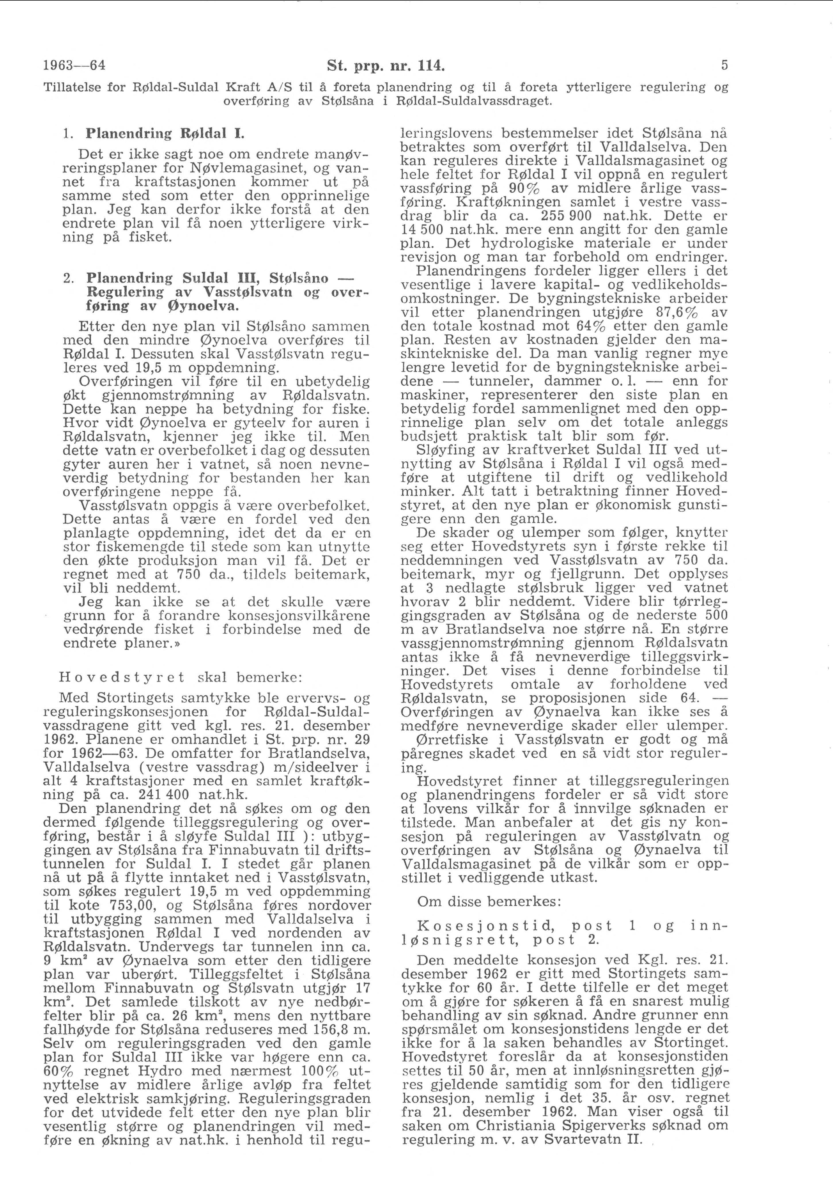 I brev av 20. april 1963 har Norsk Hydro søkt om tillatelse for Røldal-Suldal Kraft A/S til å foreta en planendring og å foreta en ytterligere regulering. Saken er forelagt Hovedstyret for vassdrags- og elektrisitetsvesenet som i brev av 3. februar 1964 har gitt følgende uttalelse til departementet: