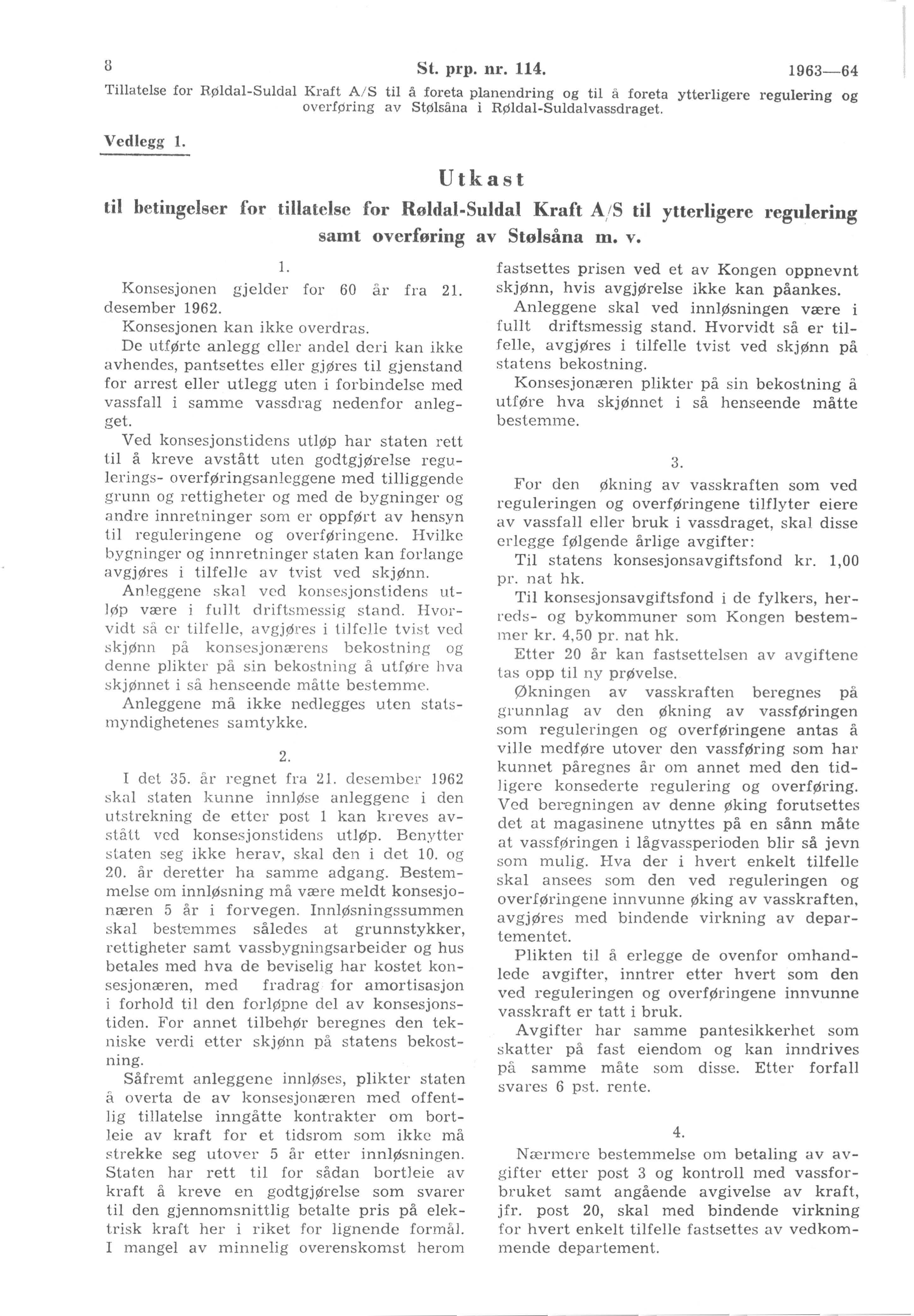 «Ved kongelig resolusjon av 21.-12. 1962 ble Røldal-Suldal Kraft A/S meddelt konsesjon til erverv og regulering av Røldal Suldalvassdraget m. v.