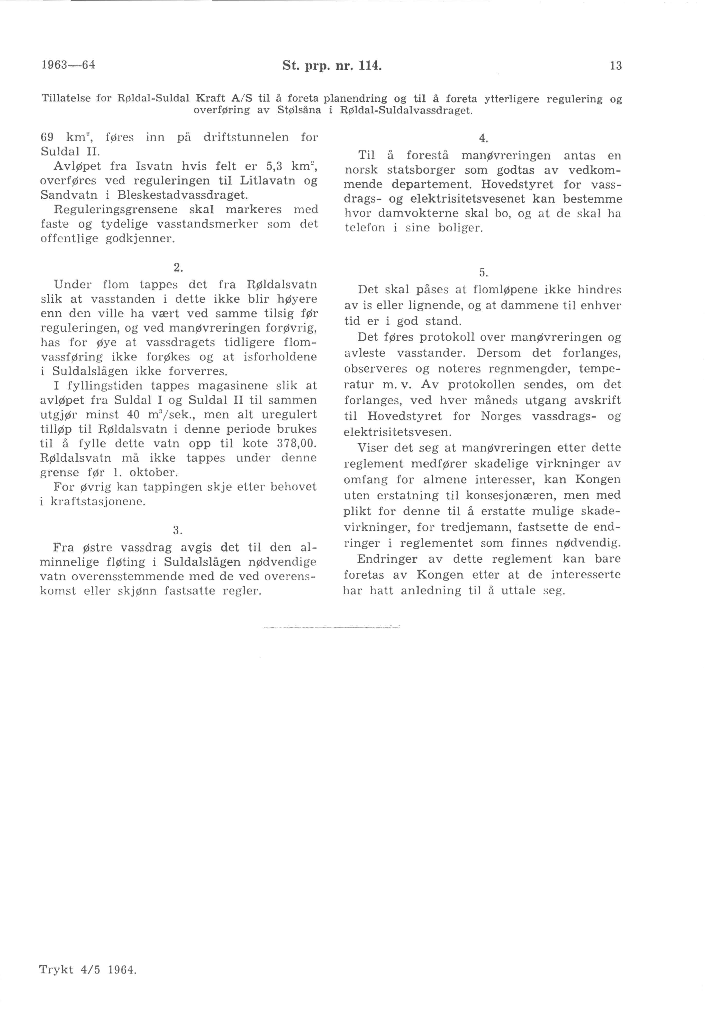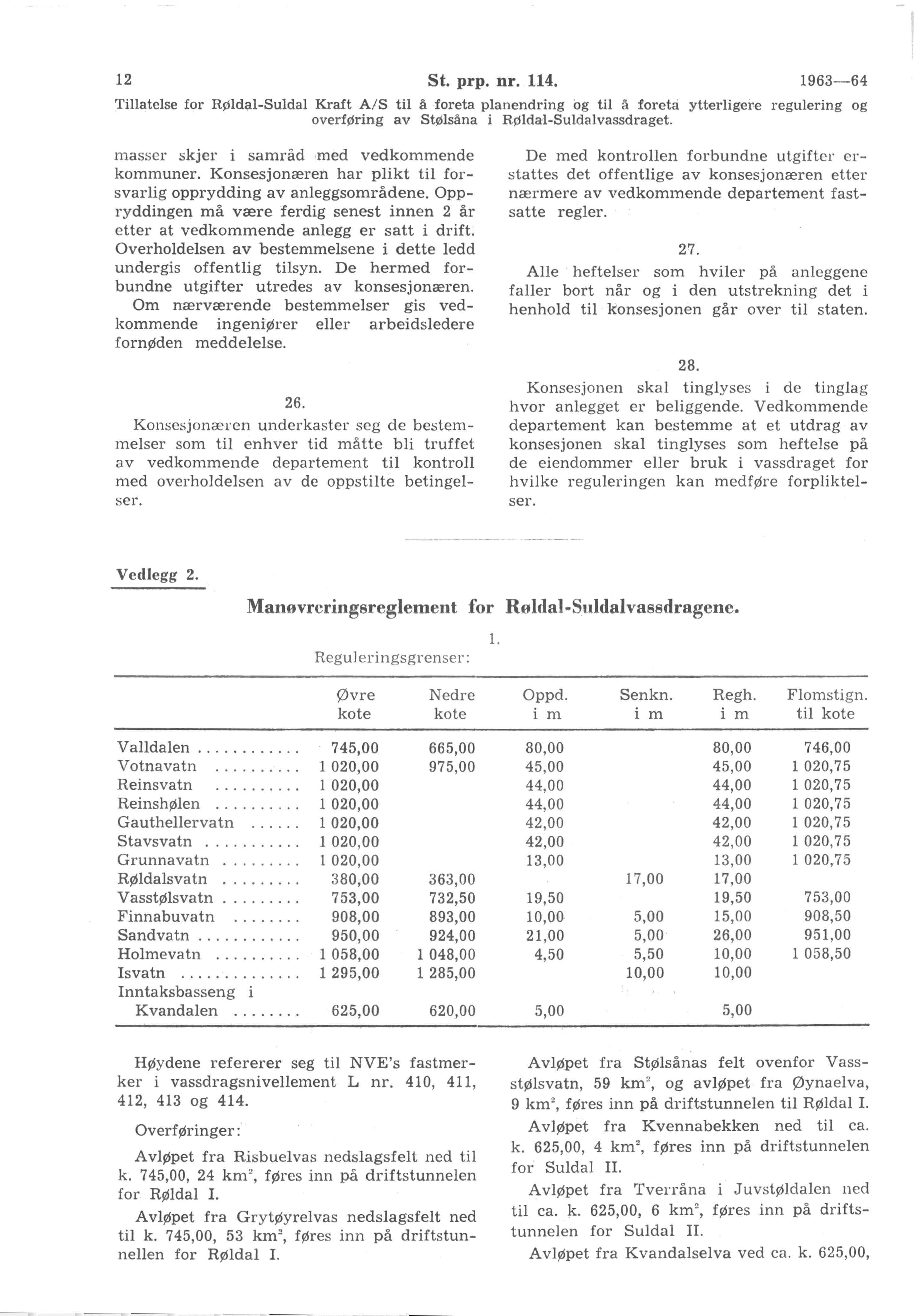 Med Stortingets samtykke ble ved kongelig resolusjon av 21. desember 1962 Røldal Suldal Kraft A/S gitt tillatelse til erverv og regulering i Røldal-Suldalvassdraget m.v. jfr. St. prp. nr. 29 for 1962-63, Innst. S. nr. 59 for s.å. og «Meddelte Vassdragskonsesjoner» for 1962 side 211-219.