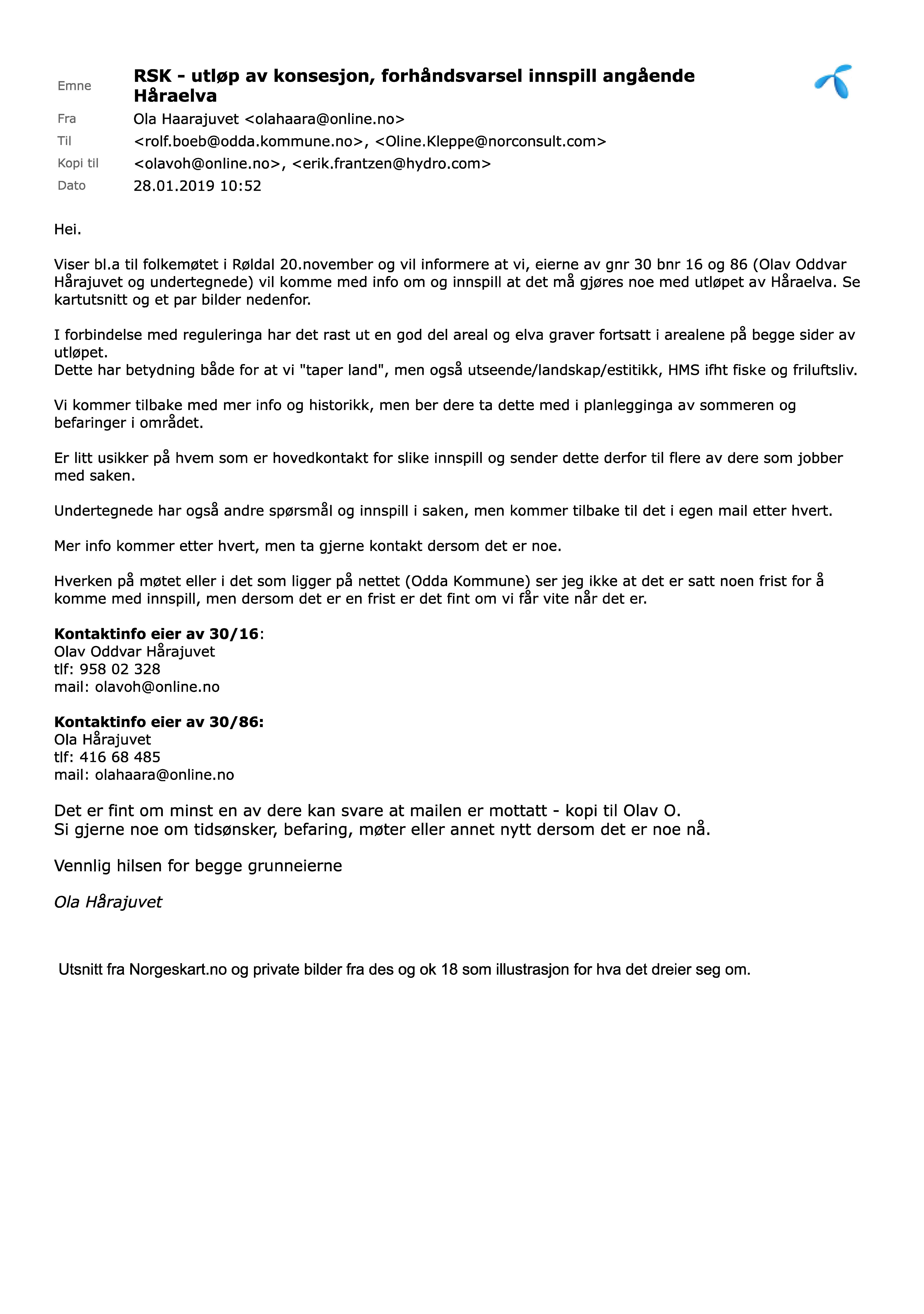 Vennlig hilsen for grunneierne Olav O Hårajuvet (30/16), tlf 958 02 328, mail olavoh@online.noog Ola Hårajuvet (30/86), tlf 416 68 485, mail olahaara@onlline.noOla Hårajuvet Følgende dokumenter er vedlagt: