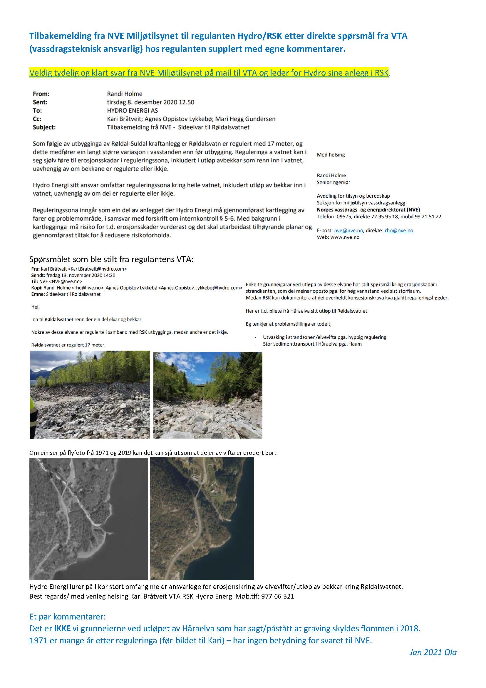 Som avtalt sendes en oppsummering av situasjonen rundt utløpet av Håraelva, utrasing og graving i arealene langs nedre del av elva samt historikk og dokumentasjon for hva som er tatt opp med regulanten uten at de har tatt og gjort noe med det de faktisk har ansvaret for. Det er heller ikke noe i noen av de utabeida rapportane som sier noe om forholdet – det var lovet.