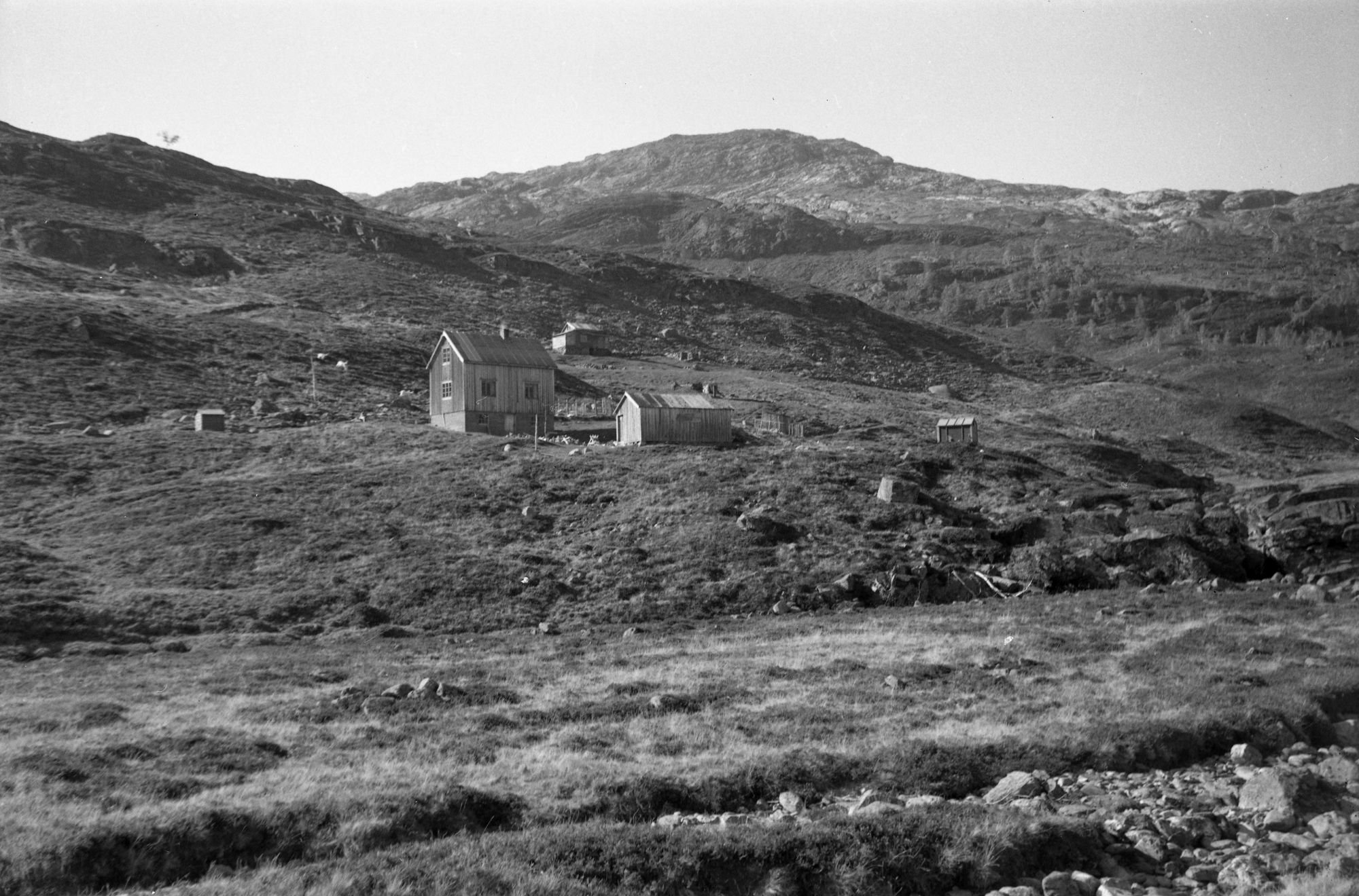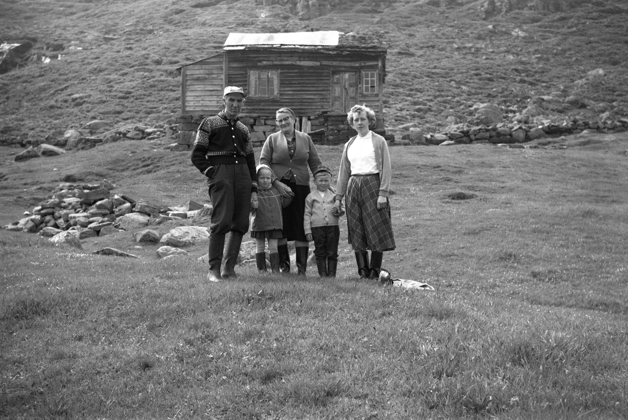 Artikkelforfattaren framfor gamle Grytingsstølen i 1964 saman mor Helga, syskenbarn Kjellaug, gome Ingebjørg og gofa Nils. Foto: Nils N. Saltvoll