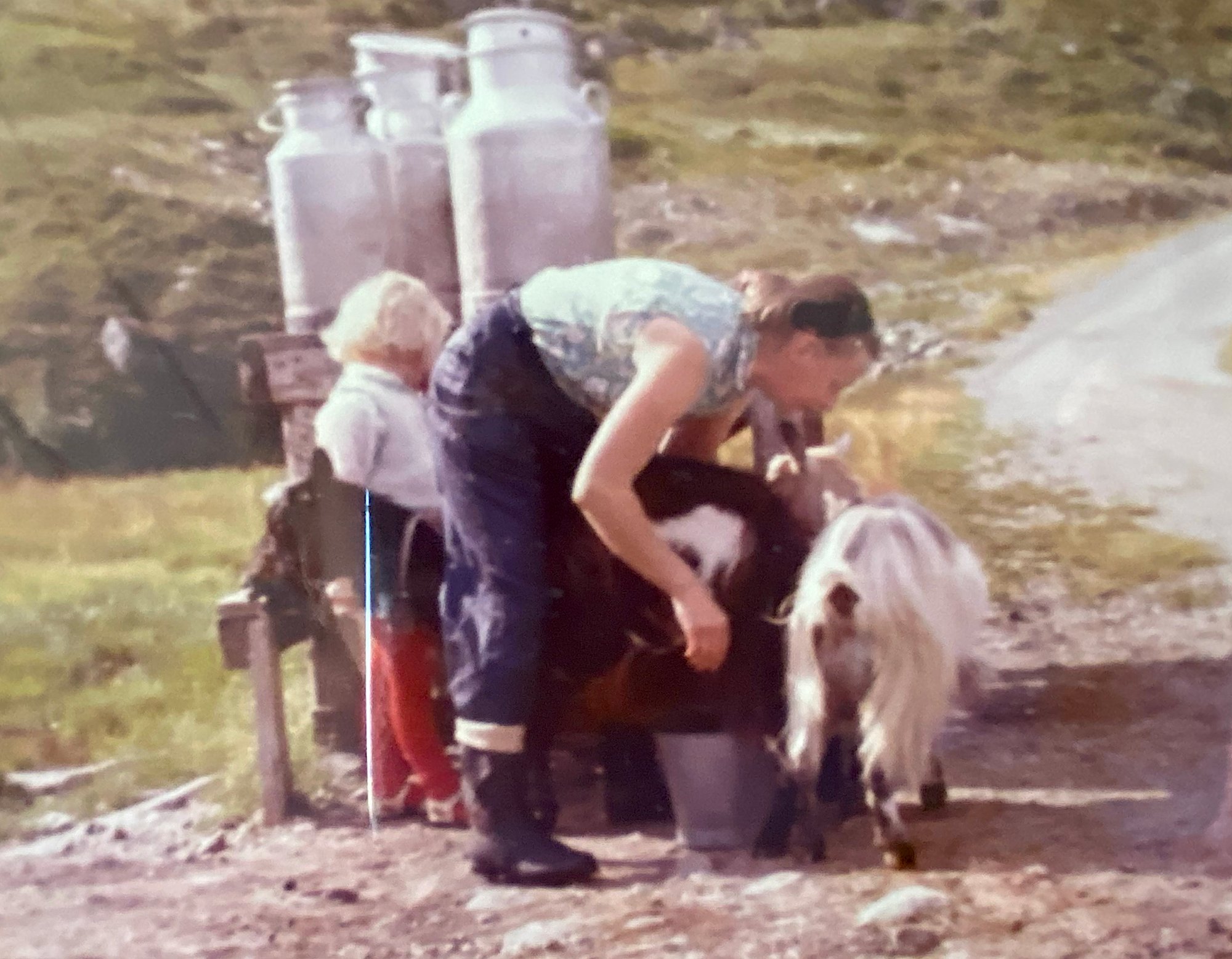Frå stølinga tidleg på 70-talet. Syster Irene hjelper mor Helga. Foto: Inge Saltvoll